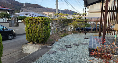 樹木のないお庭の除草作業・除草剤散布と通路側の庭木の剪定